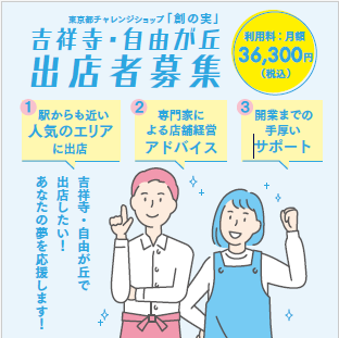 東京都チャレンジショップ「創の実」 吉祥寺・自由が丘は、都内の商店街で開業を目指す若手・女性を対象に出店者を募集します!